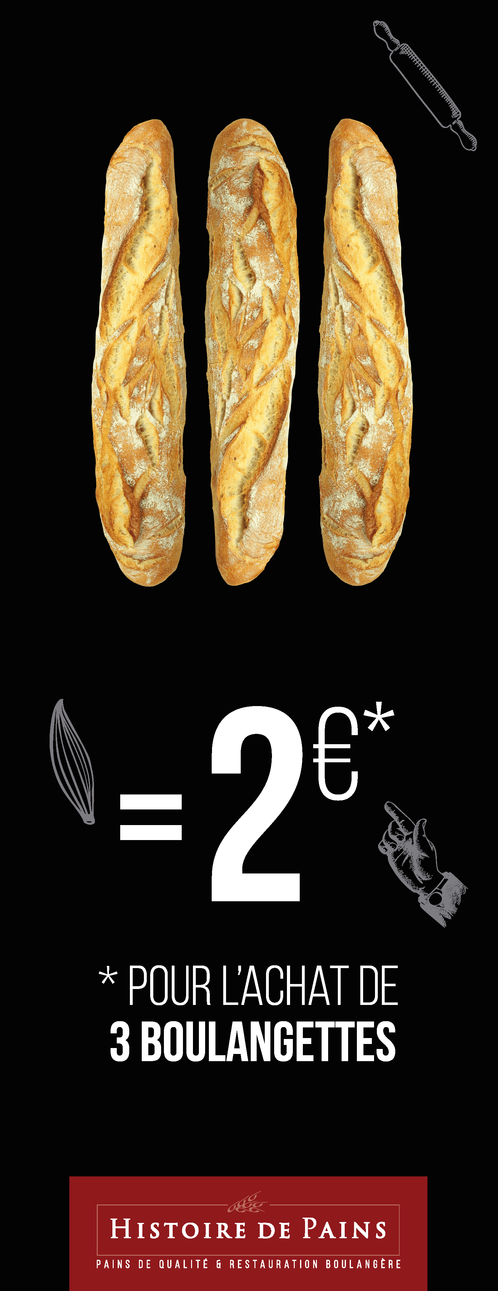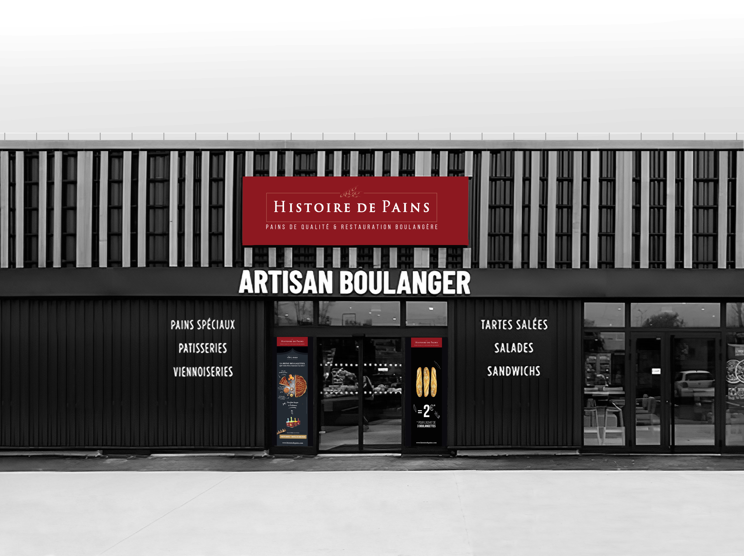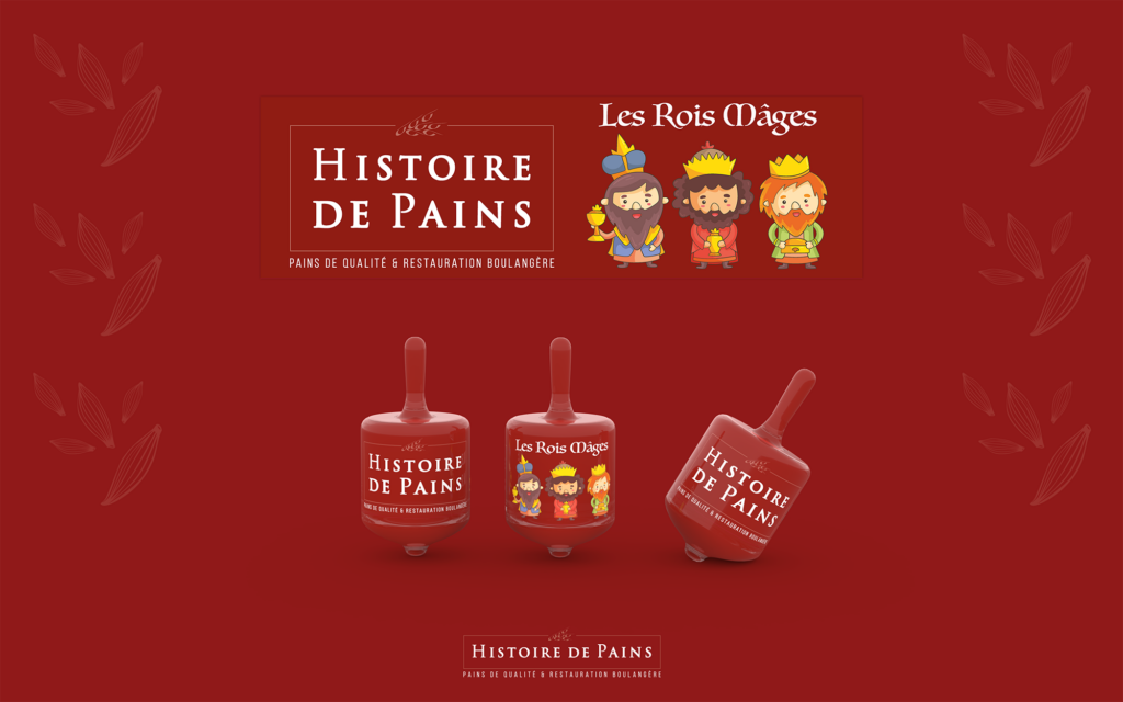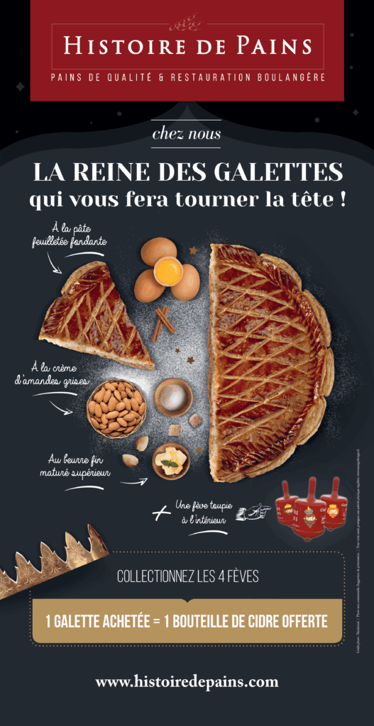 Histoire de Pains nous a sollicités pour renforcer leur visibilité extérieure et développer une opération promotionnelle autour de la galette des rois. La marque disposait déjà de son identité visuelle et de sa charte graphique : notre mission consistait à les déployer efficacement sur des supports grand public et à concevoir un événement capable de créer du trafic en boutique.