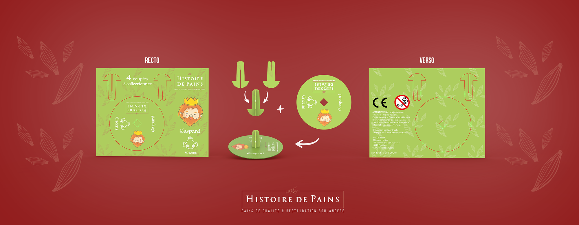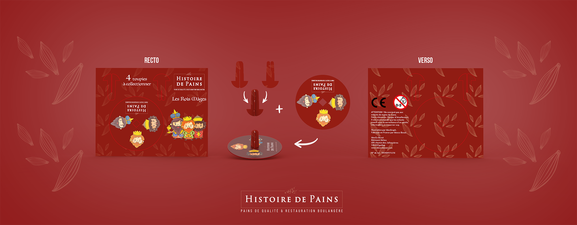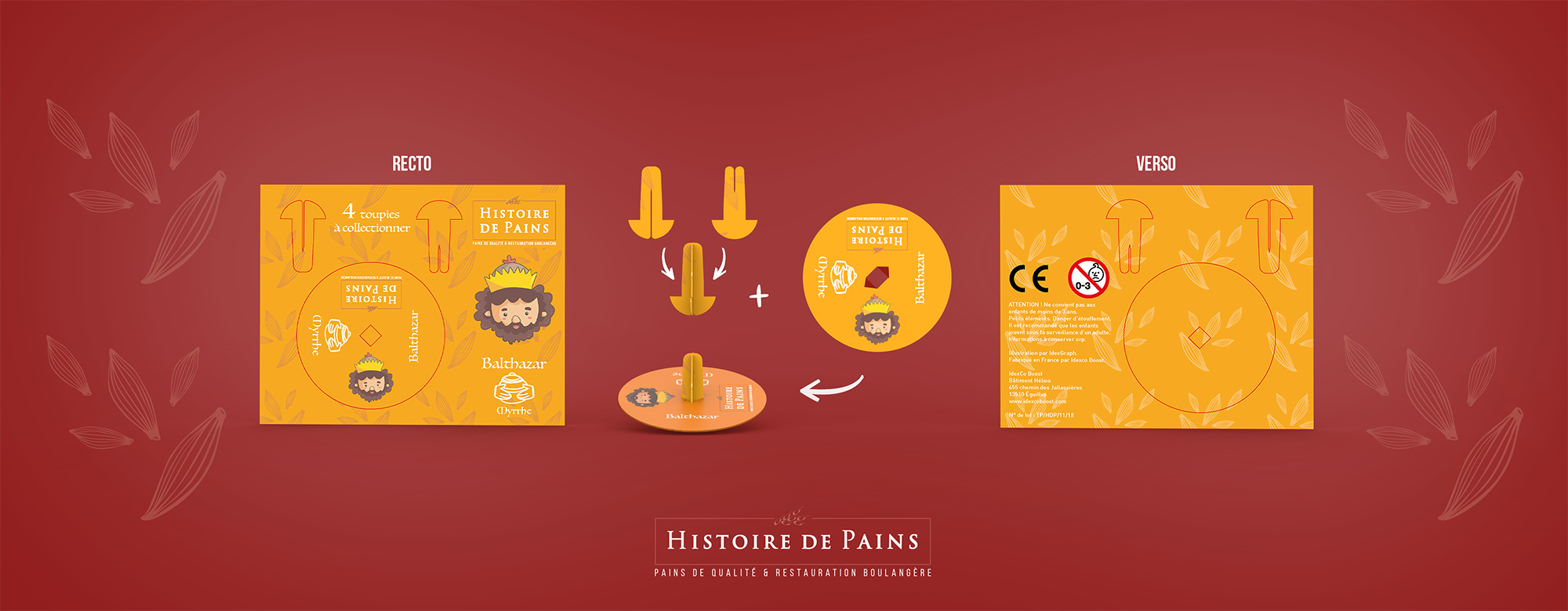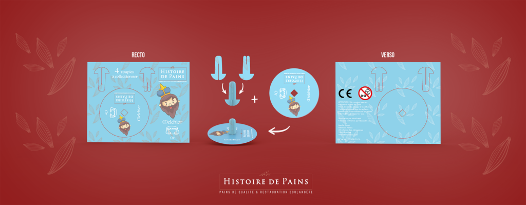 En complément de ces fèves, j’ai conçu des toupies en carton à assembler soi-même, proposées à chaque achat de galette, pour enrichir l’expérience et prolonger l’animation en dehors du point de vente.