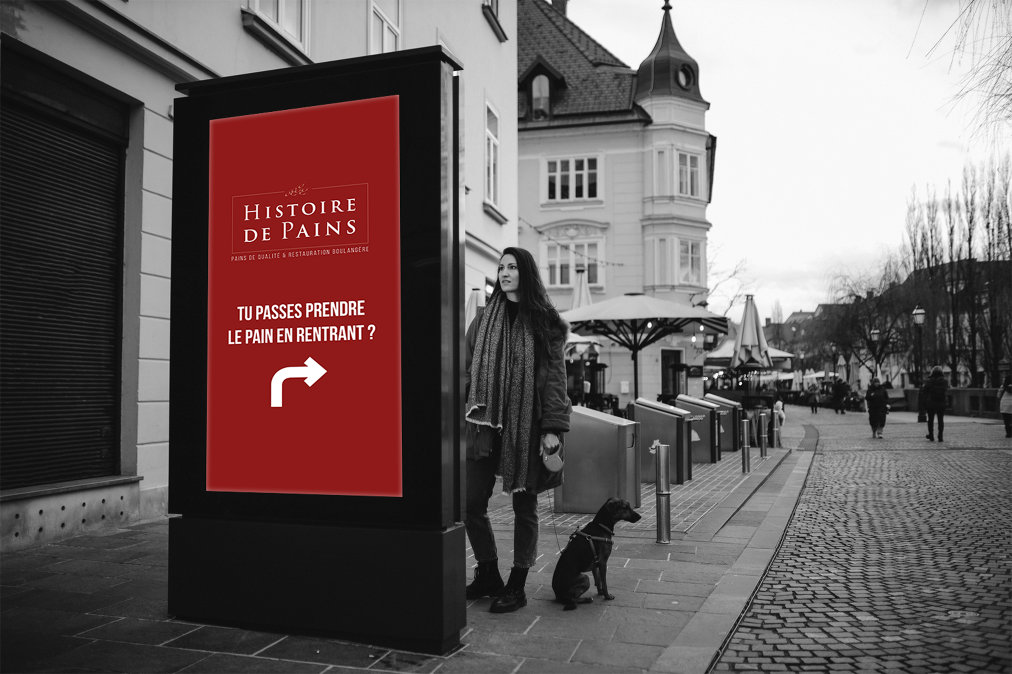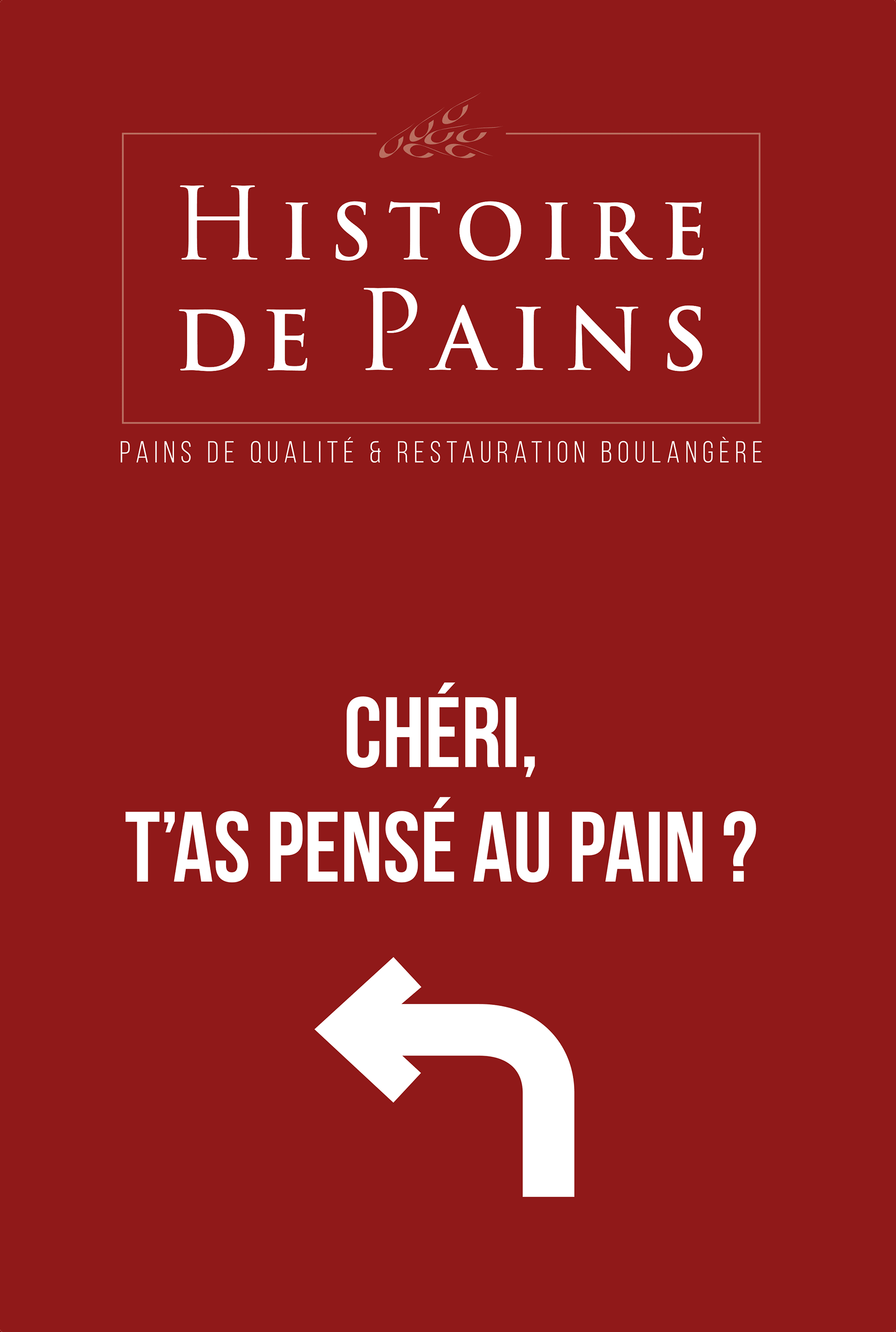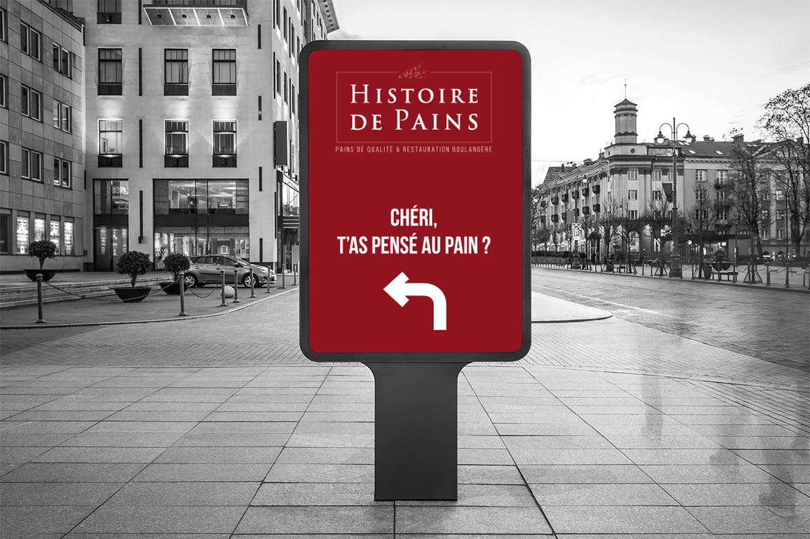 Sur le volet communication extérieure, j’ai décliné l’identité de la marque sur l’ensemble des supports visibilité : panneaux publicitaires, abribus, affiches vitrine et chevalets extérieurs. Le parti pris graphique repose sur une accroche directe et mémorable, « Chéri, t’as pensé au pain ? », associée à une flèche directionnelle, pour un message immédiatement lisible et efficace en contexte urbain.