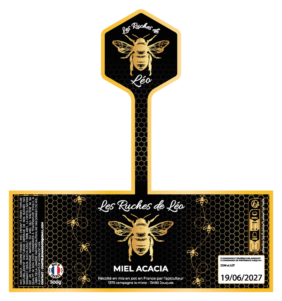 Le projet a débuté par une phase de recherche d’univers : ambiances, couleurs, typographies. Léo souhaitait un produit visuellement premium, capable de valoriser immédiatement la qualité de son miel. La direction s’est naturellement orientée vers une palette or et noir, le doré évoquant la richesse du miel et le noir apportant ce côté luxueux et soigné qui différencie un produit artisanal d’un simple pot en rayon.