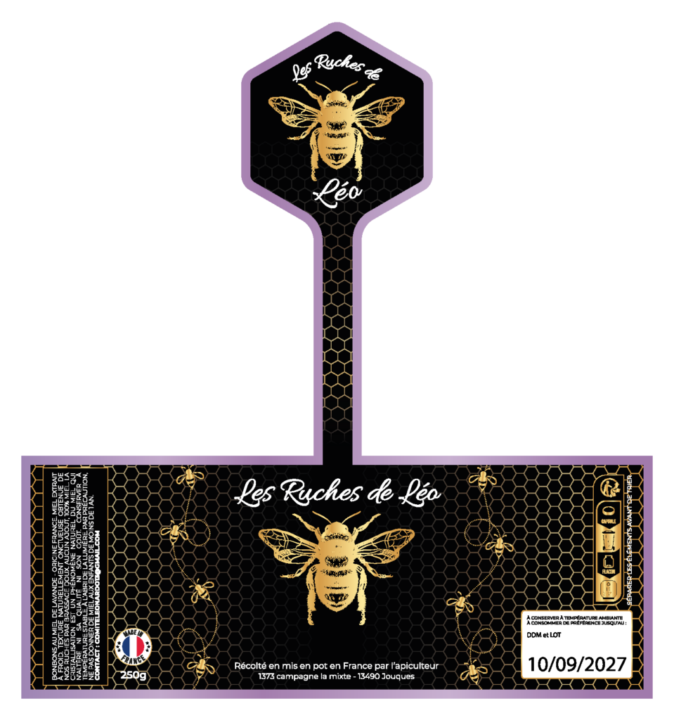 Cette étiquette a ensuite été déclinée sur l’ensemble de la gamme : Lavande, Acacia, Toutes Fleurs, Crémeux et Bonbons au miel, chaque variété partageant la même structure graphique tout en conservant sa lisibilité propre.