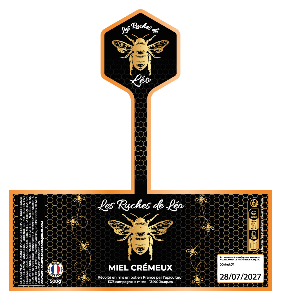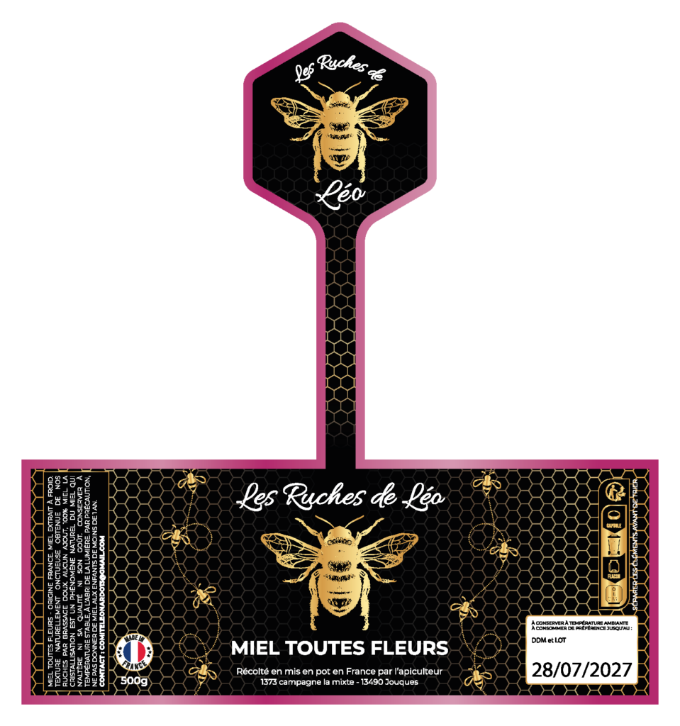 Le travail sur les étiquettes a représenté un défi particulier. Léo souhaitait que chaque pot soit visuellement scellé, l’étiquette devant couvrir à la fois le couvercle et descendre le long du bocal pour attester de l’intégrité du produit. J’ai conçu un format sur-mesure répondant à cette contrainte, avec en point focal une illustration d’abeille dorée, frontale et affirmée, devenue la signature visuelle immédiate de la marque.